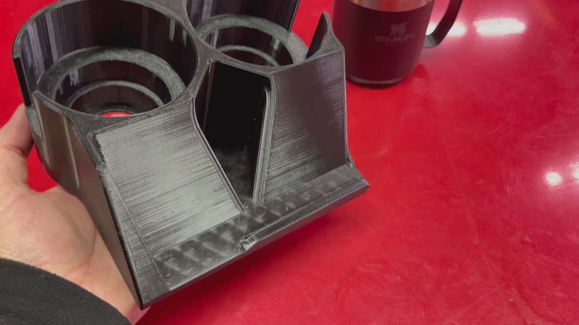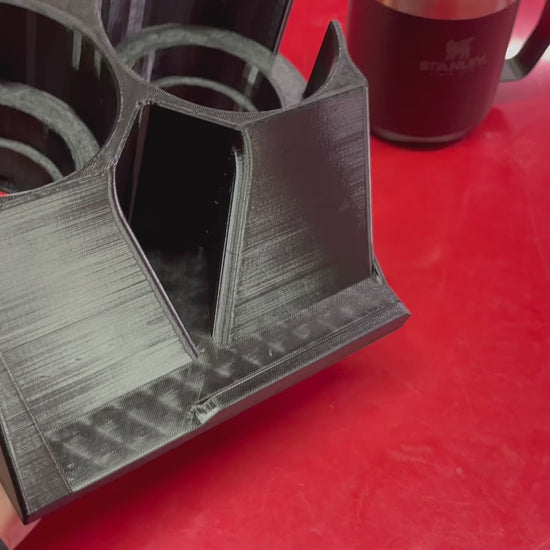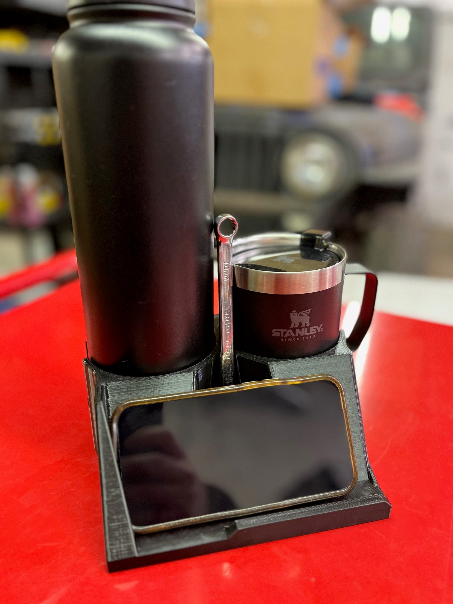Bring modern convenience to your classic truck with this portable console that holds phones, skinny cans, regular cans, large bottles, and handled mugs.